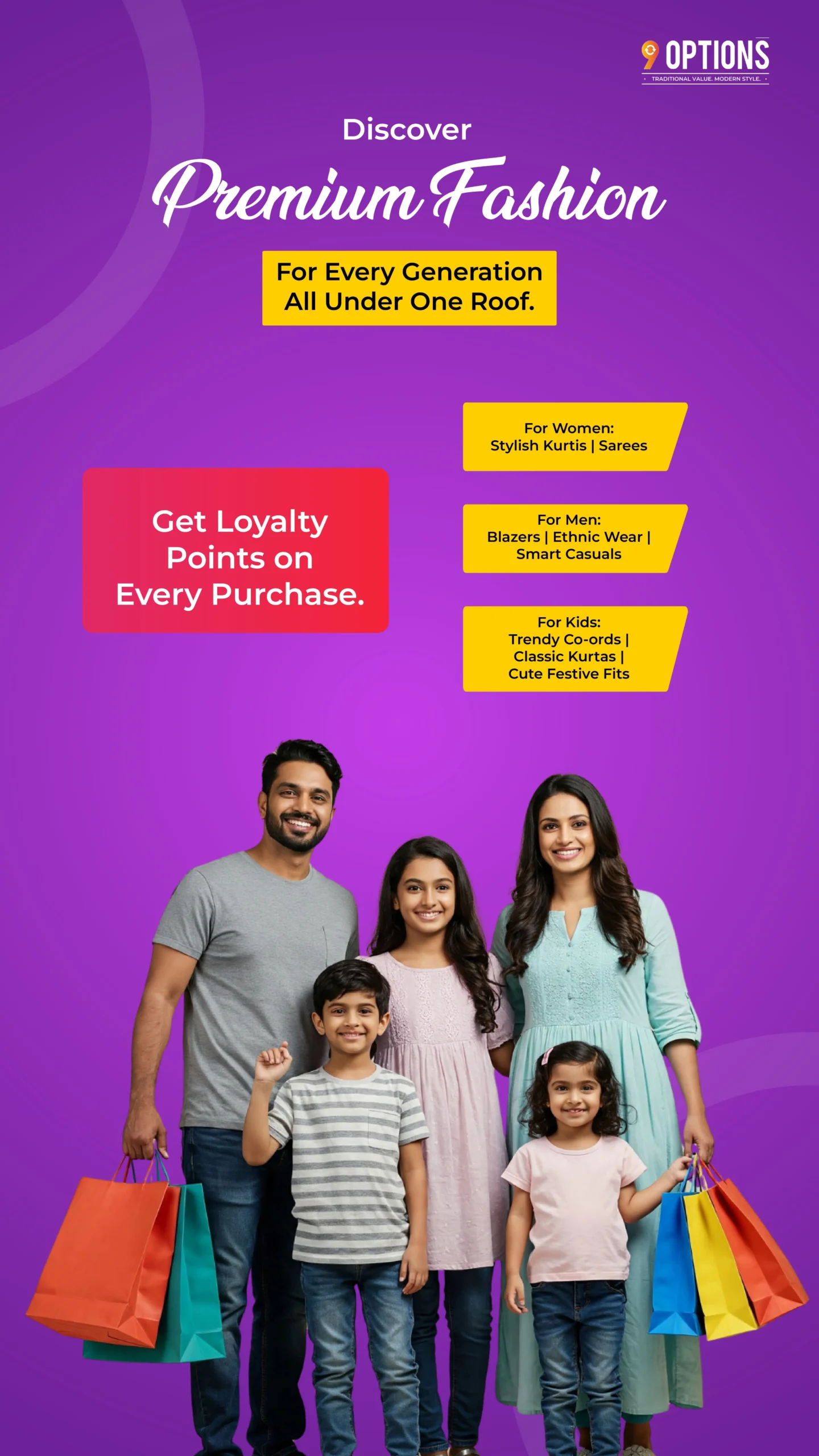 9 Option is not just a clothing store — it’s a fashion hub for the entire family. Located in the heart of Hadapsar, Pune, our outlet offers a unique blend of tradition, trend, and comfort under one roof. With a wide range of men’s wear, women’s wear, kids’ wear, ethnic collections, designer sarees, kurtis, party wear, and stylish western outfits, we cater to every age, style, and occasion.